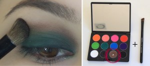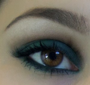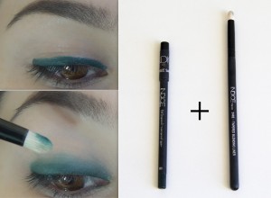 2. Depois utilize um pincel chanfrado para aplicar a sombra marrom. Com o mesmo lápis verde em gel pinte a linha d’água.