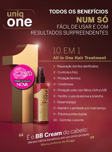 A nova linha Uniq One é a novidade,  desde seu lançamento recebeu ótimas criticas e vários prêmios pela sua eficiência, qualidade e praticidade. O leave-in nos traz 10 benefícios e resultados surpreendentes!